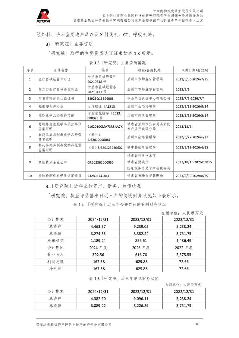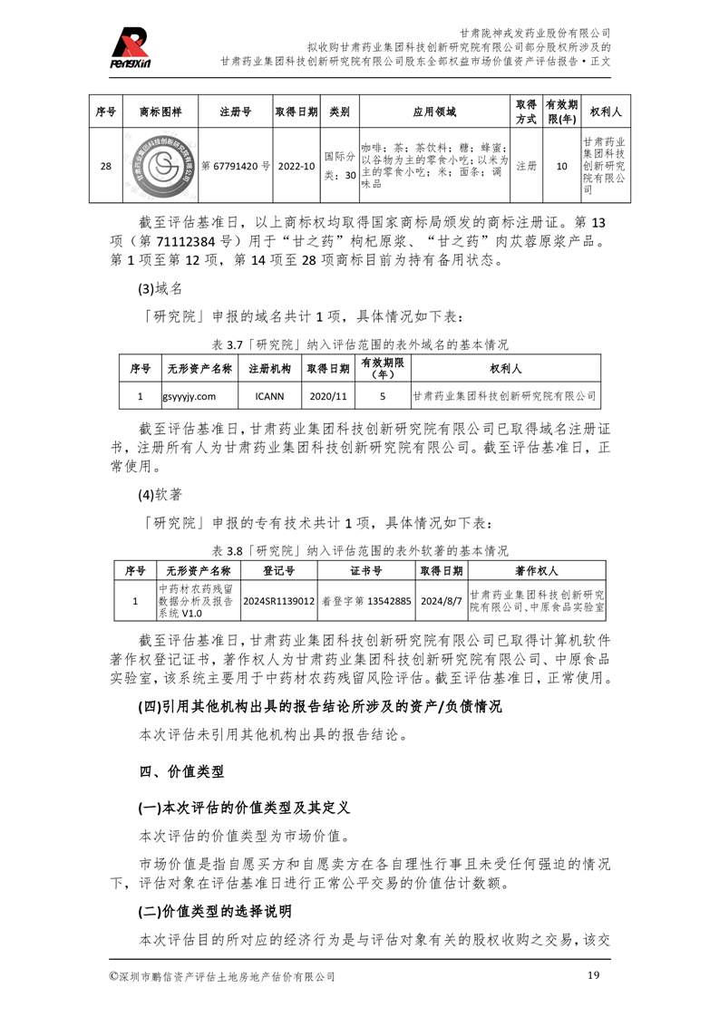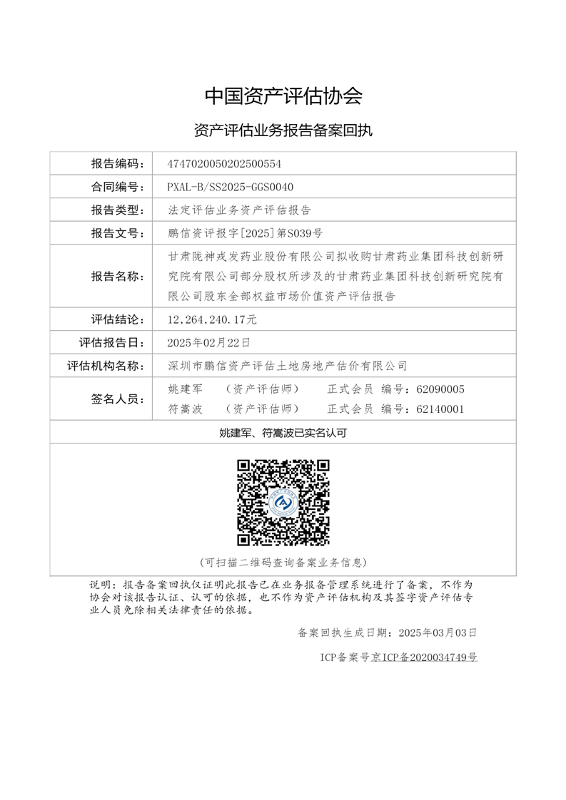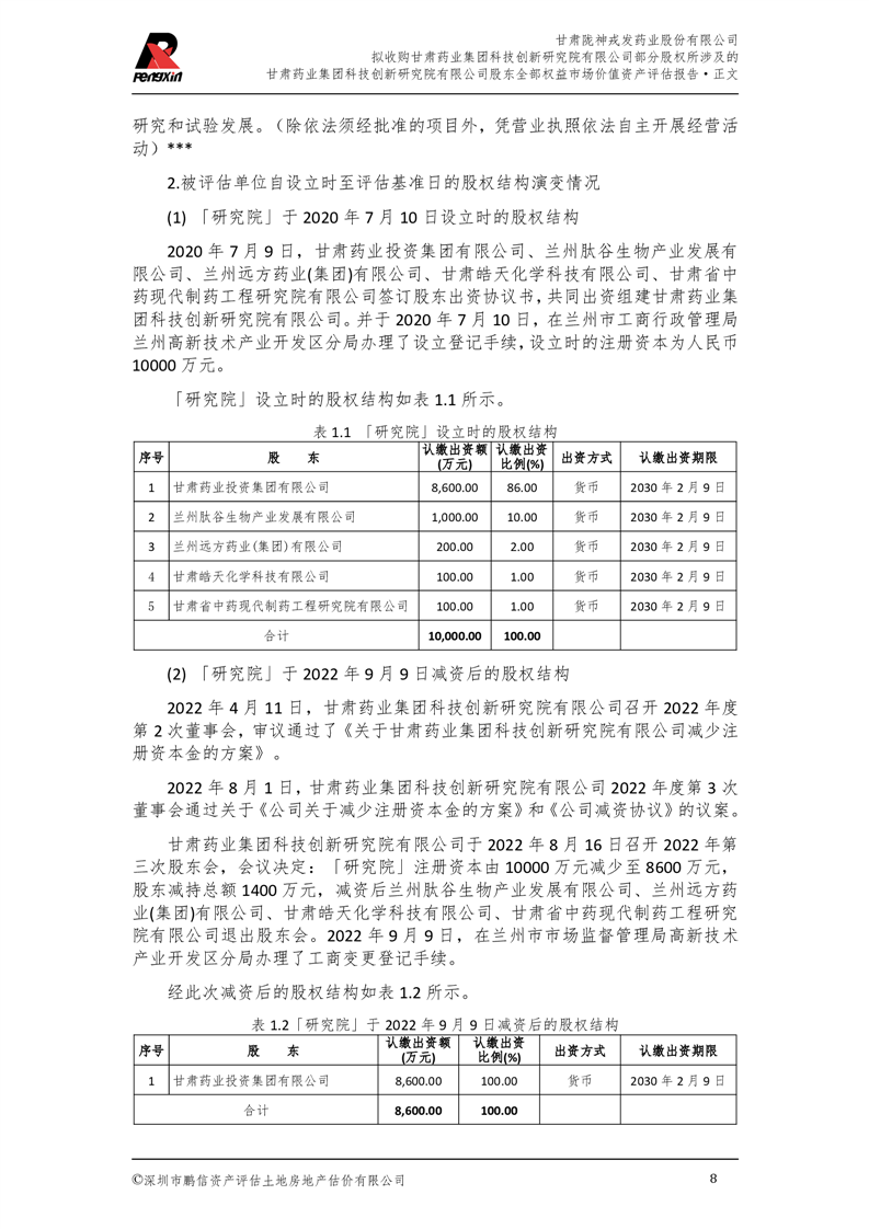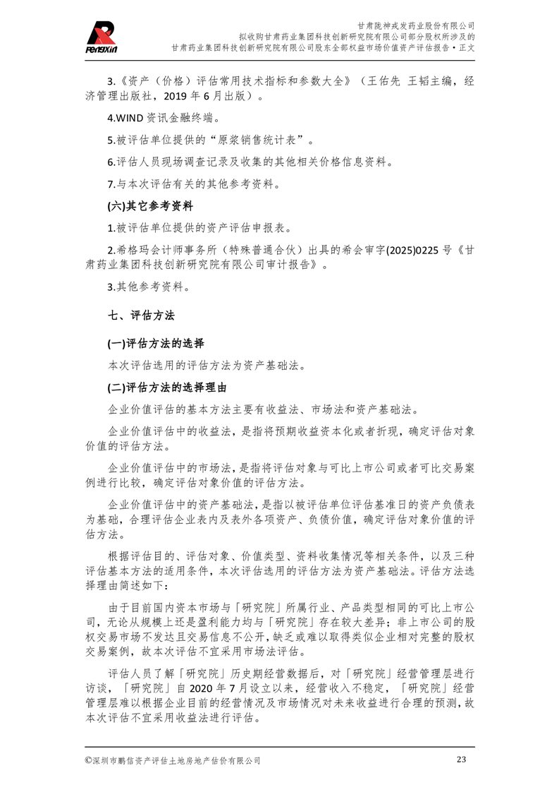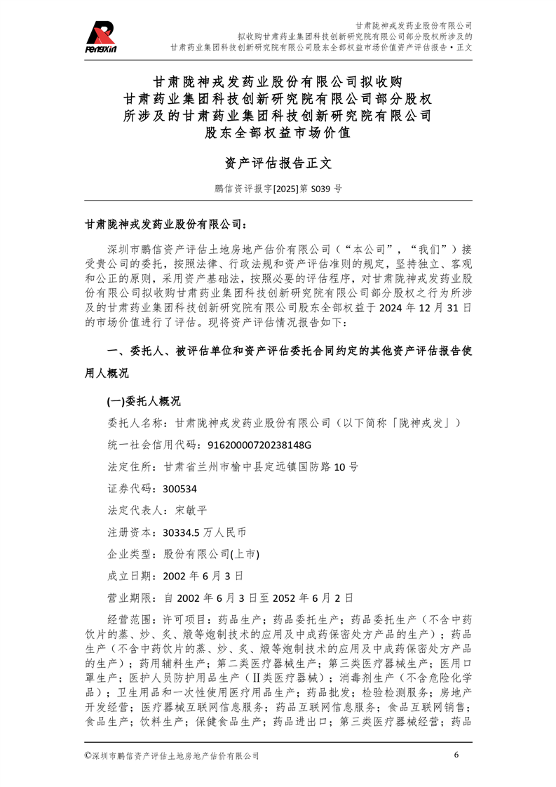 甘肅藥業(yè)集團(tuán)科技創(chuàng)新研究院有限公司股東全部權(quán)益市場(chǎng)價(jià)值資產(chǎn)評(píng)估報(bào)告(鵬信資評(píng)報(bào)字[2025]第S039號(hào))