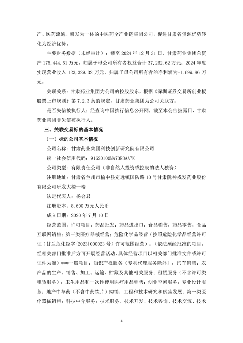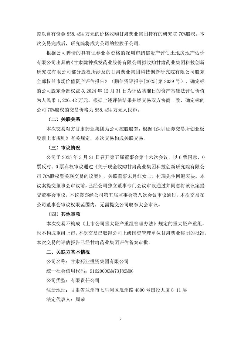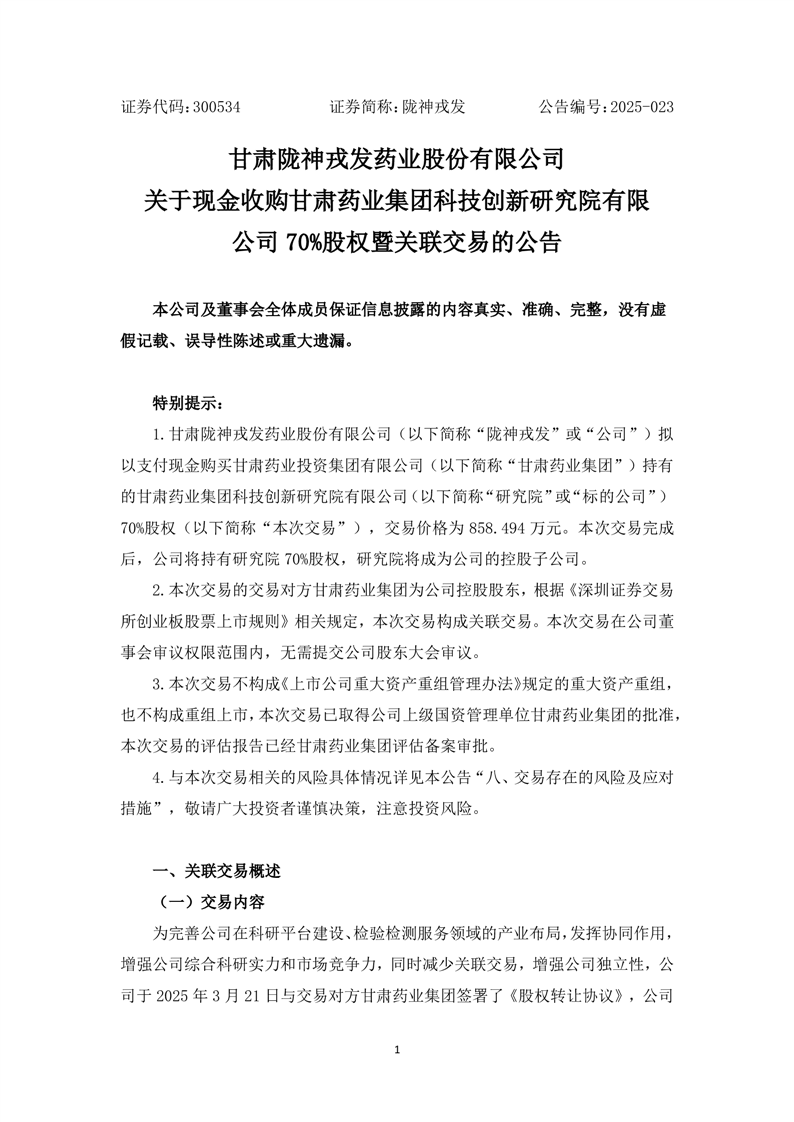 關于現(xiàn)金收購甘肅藥業(yè)集團科技創(chuàng)新研究院有限公司70%股權(quán)暨關聯(lián)交易的公告