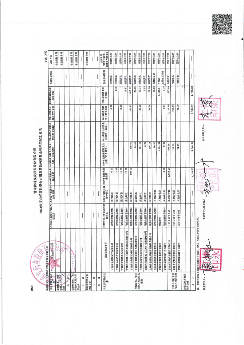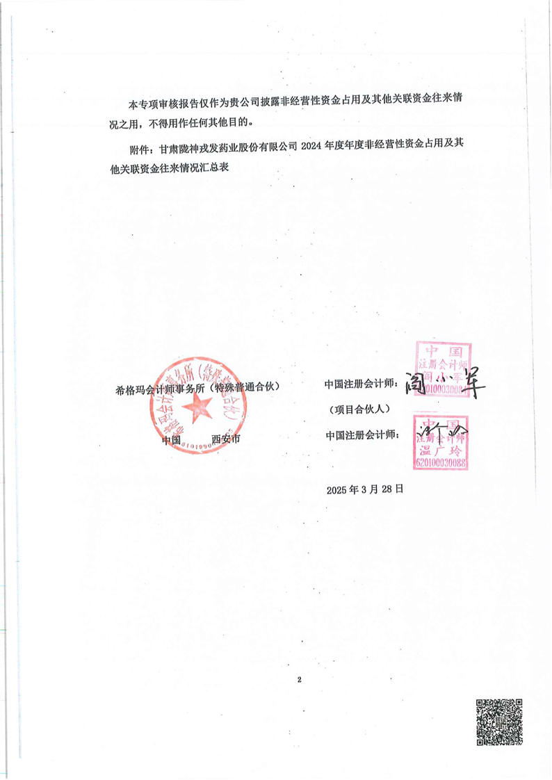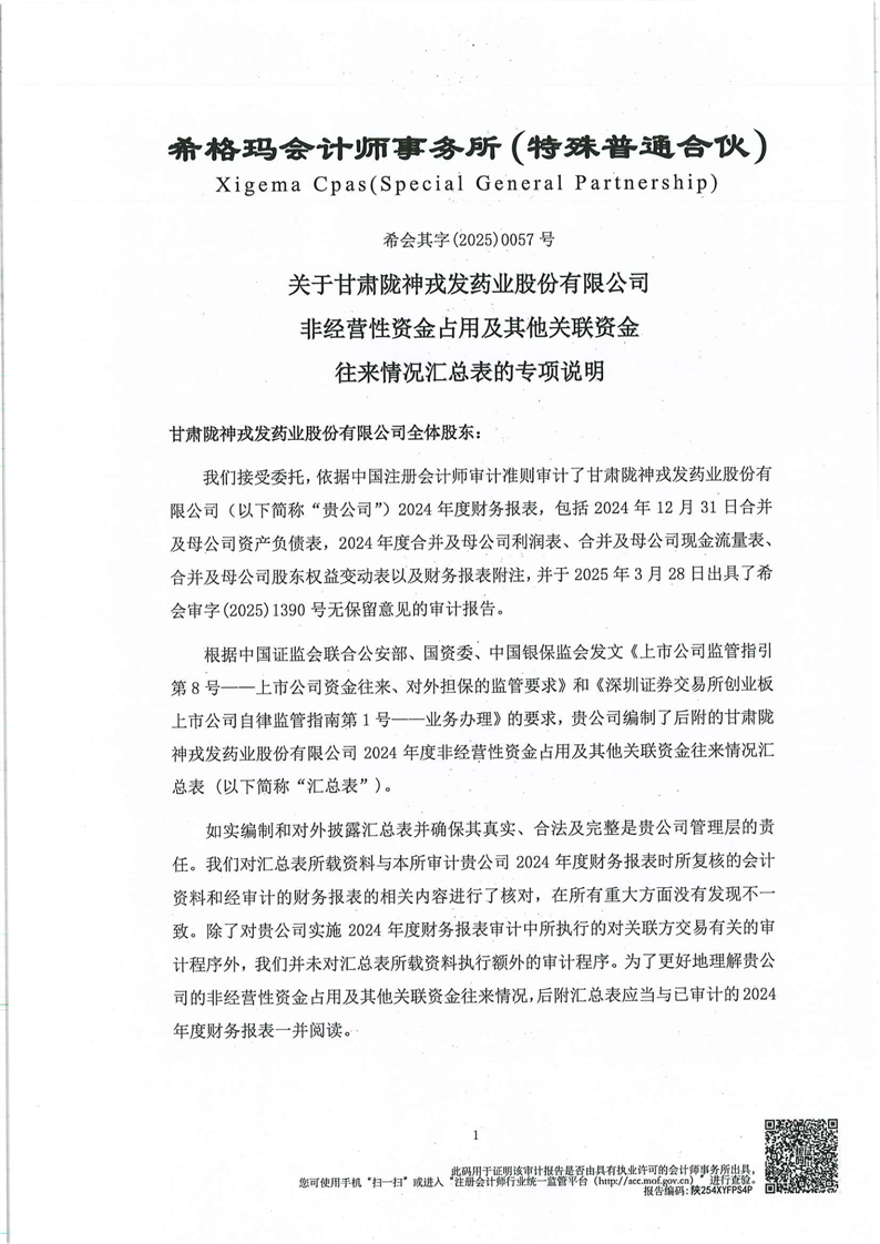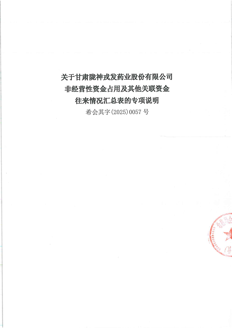 關于甘肅隴神戎發(fā)藥業(yè)股份有限公司非經營性資金占用及其他關聯資金往來情況匯總表的專項說明