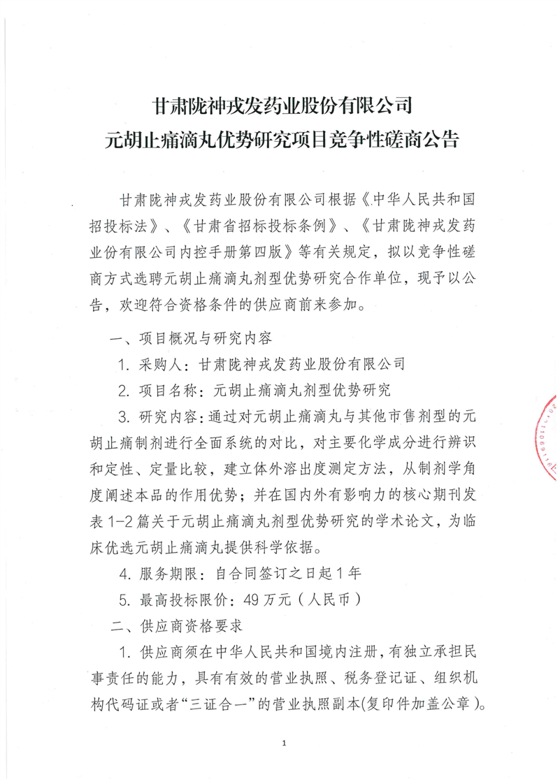 甘肅隴神戎發(fā)藥業(yè)股份有限公司元胡止痛滴丸優(yōu)勢(shì)研究項(xiàng)目競(jìng)爭(zhēng)性磋商公告