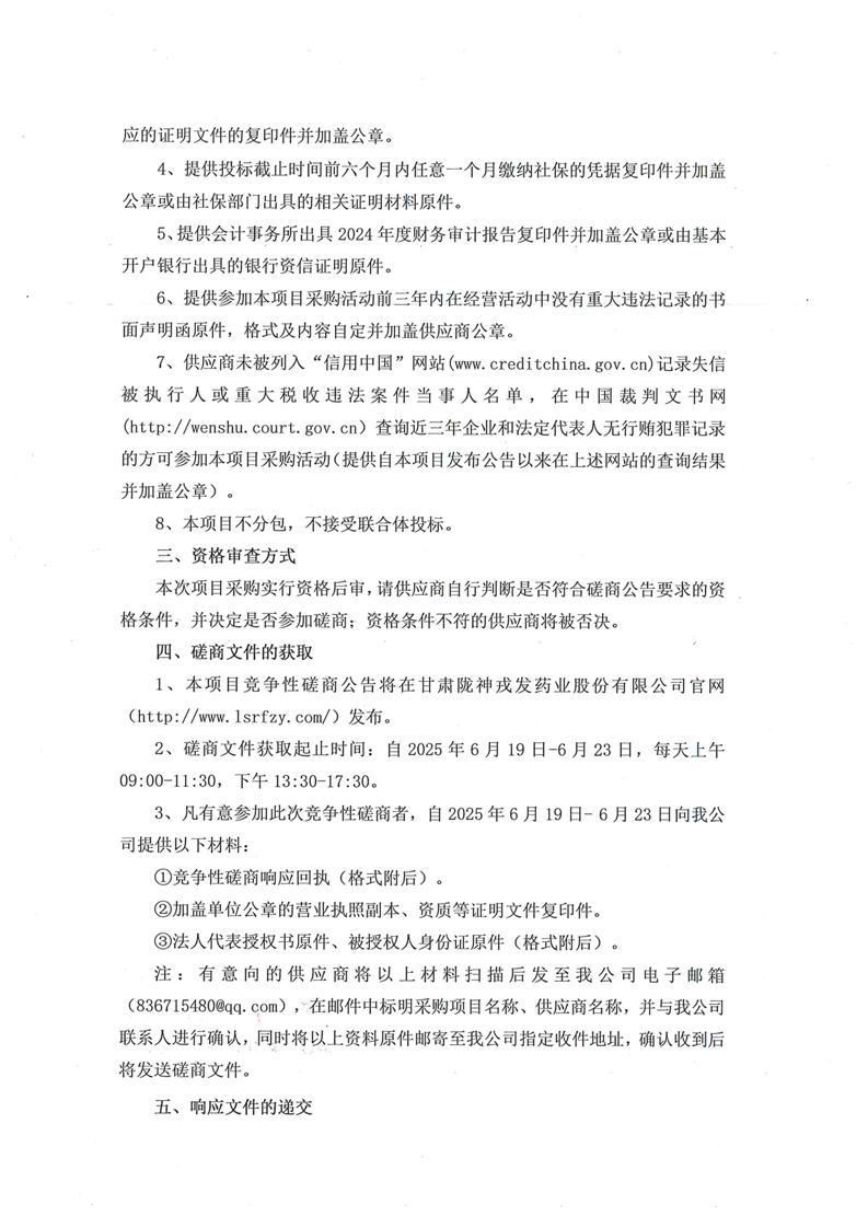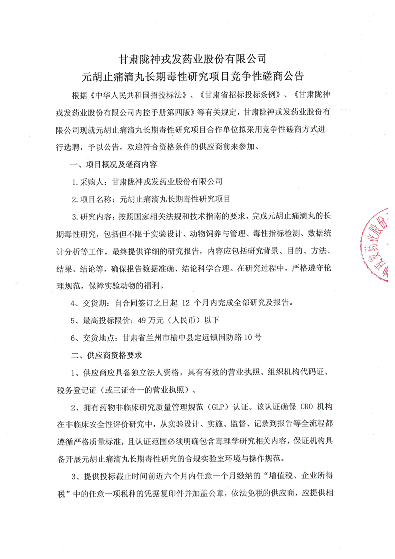 甘肅隴神戎發(fā)藥業(yè)股份有限公司元胡止痛滴丸長(zhǎng)期毒性研究項(xiàng)目競(jìng)爭(zhēng)性磋商公告