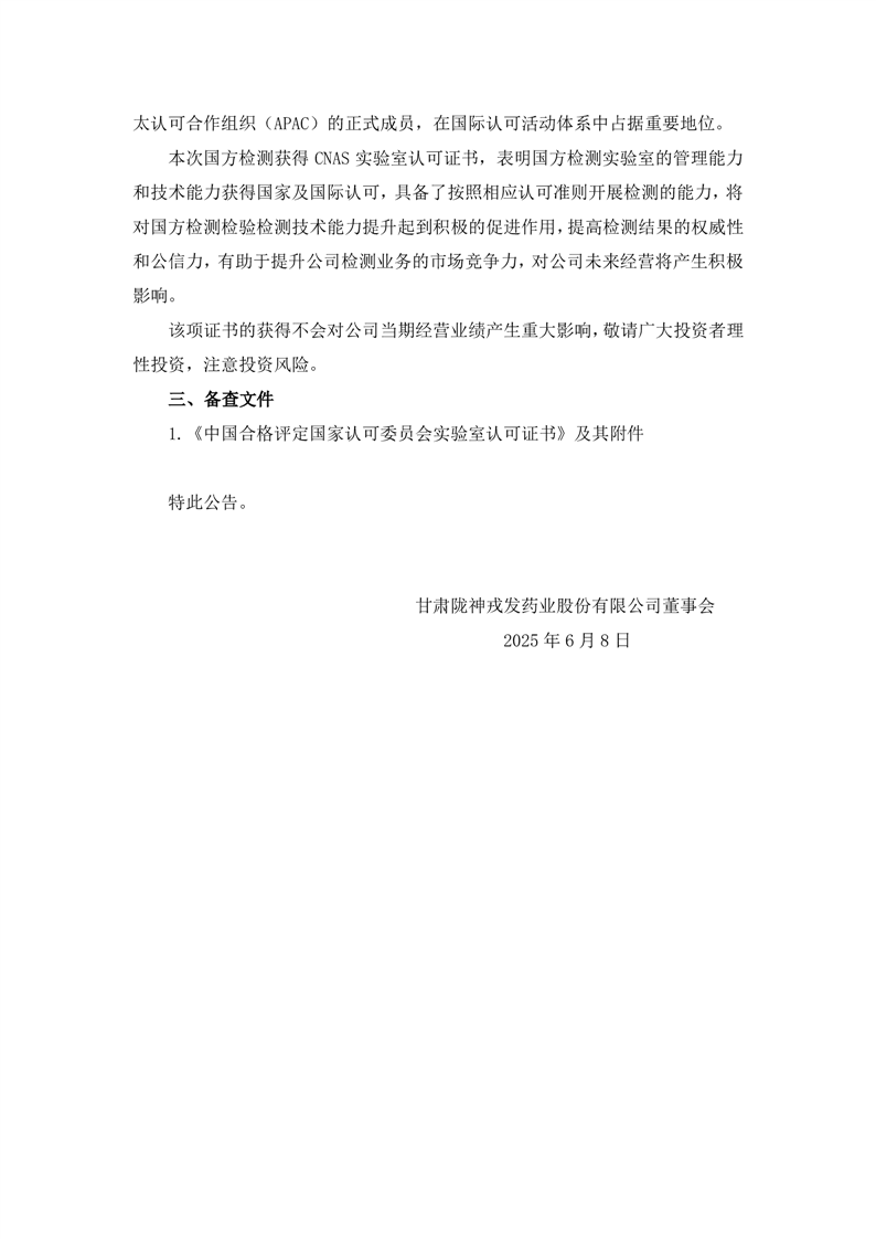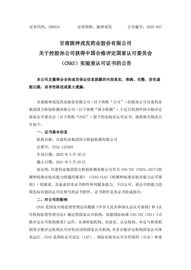 關(guān)于控股孫公司獲得中國合格評定國家認(rèn)可委員會(CNAS)實(shí)驗(yàn)室認(rèn)可證書的公告