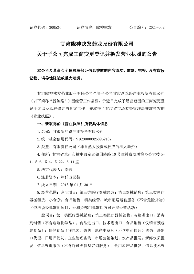 關(guān)于子公司完成工商變更登記并換發(fā)營業(yè)執(zhí)照的公告