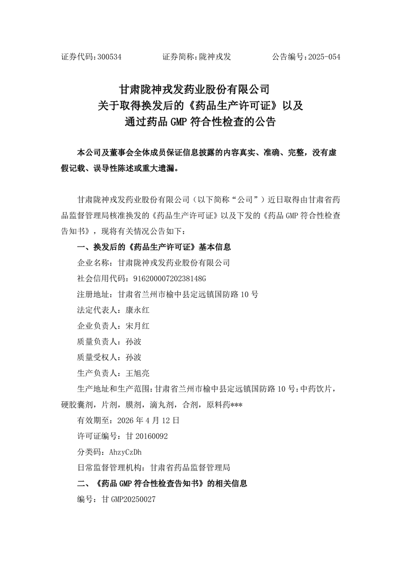 關于取得換發(fā)后的《藥品生產許可證》以及通過藥品GMP符合性檢查的公告