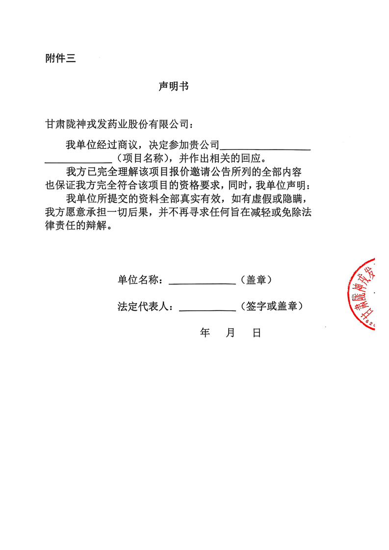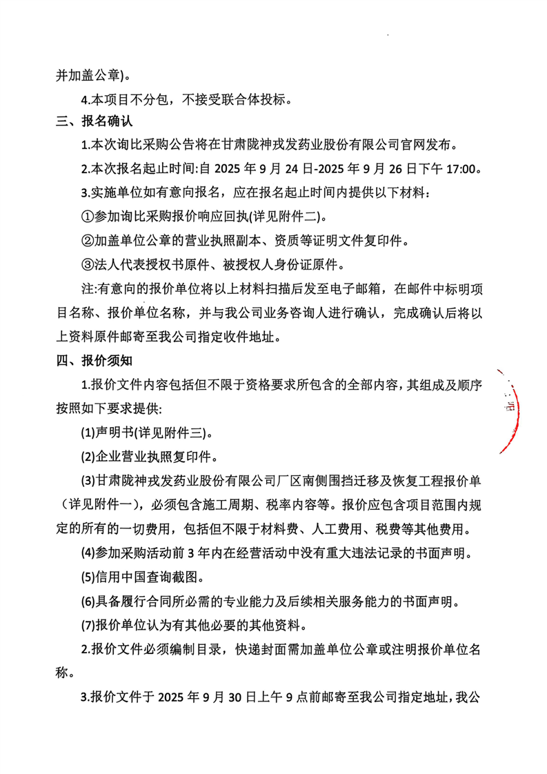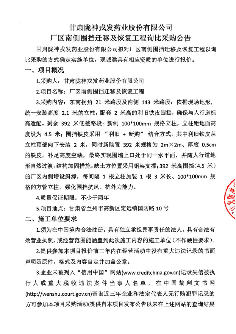 甘肅隴神戎發(fā)藥業(yè)股份有限公司廠區(qū)南側(cè)圍擋遷移及恢復(fù)工程詢比采購公告