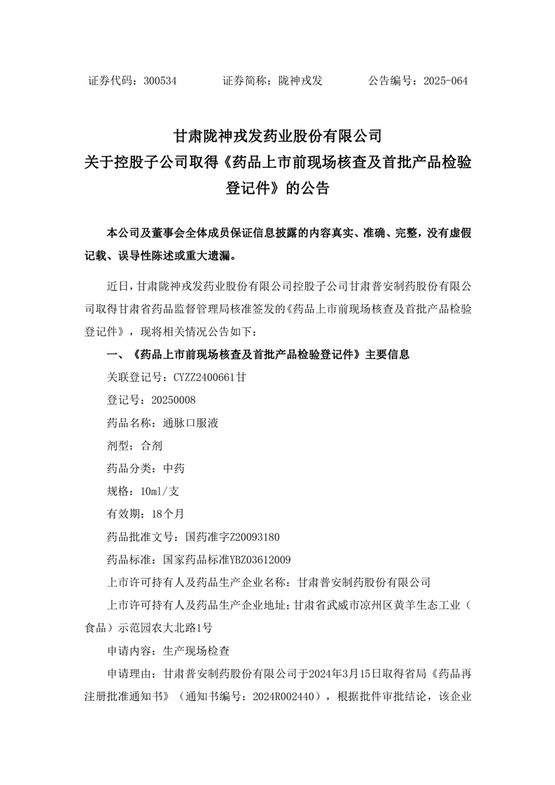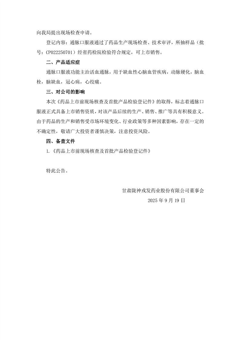 關(guān)于控股子公司取得《藥品上市前現(xiàn)場核查及首批產(chǎn)品檢驗登記件》的公告